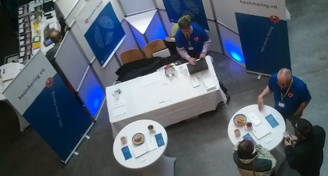 »Es war richtig interessant, einige Mitglieder von Hostsharing endlich persönlich kennenzulernen und das Angebot von Hostsharing bekannt zu machen. Die Hostsharing-Notizblöcke gingen gut weg und werden sicher einige interessierte Leute immer wieder an Hostsharing erinnern. Wir hatten am Stand viel Spaß… Viele Besucher blieben stehen und haben mit uns differenzierte Gespräche über Hostsharing geführt.«