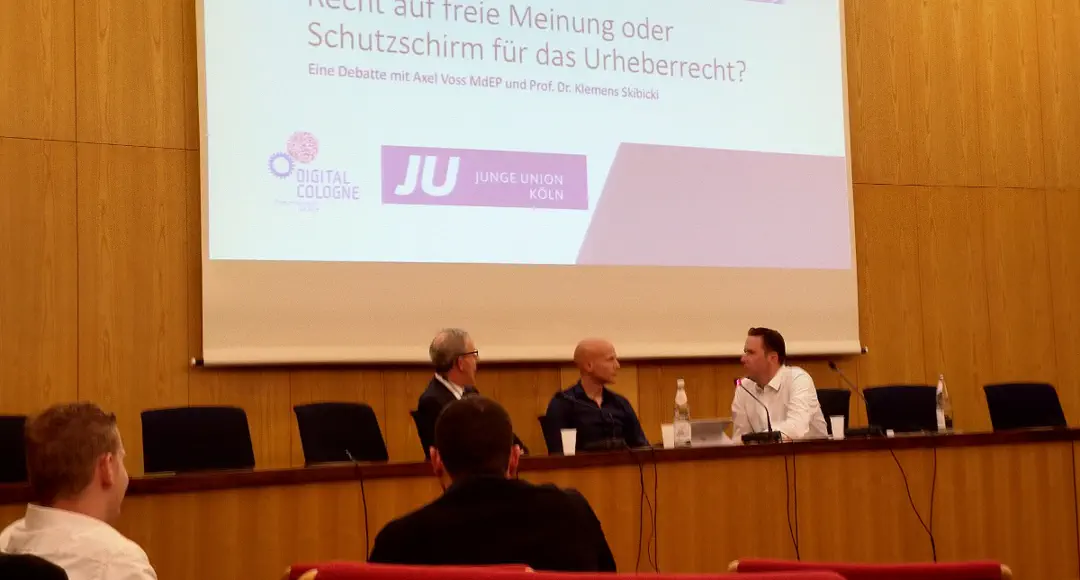 Köln, 5. Oktober 2018. Zu einer hochbrisanten öffentlichen Veranstaltung luden Junge Union Köln und die Industrie- und Handelskammer (IHK) zu Köln im Rahmen von Cologne Digital zwei erklärte Gegenspieler zur Diskussion unter dem Motto “Recht auf freie Meinung oder Schutzschirm für das Urheberrecht” ein. Hochbrisant, weil das eine der zentralen Weichenstellungen zukunftsgerichteter Digitalpolitik und somit Chancen künftiger Wertschöpfung in der EU überhaupt beleuchtete, was wohl immer noch nicht in der allgemeinen Öffentlichkeit angekommen ist.